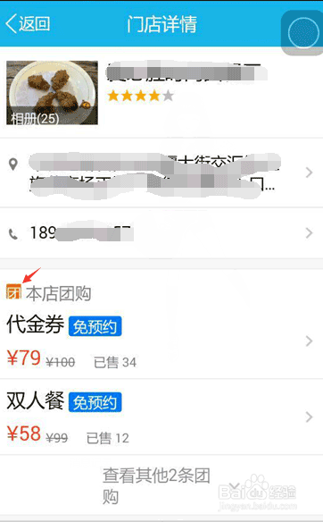 7、点开可以看到门店详情,上面有店家的地址和电话,有团购标志的可以事先团购,会便宜很多哦