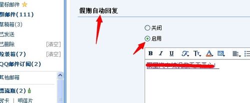 3、在常规的下面找到“假期自动回复”并选择“启用”选项。在下面的方框中还可以编辑好,邮件自动回复的内容。