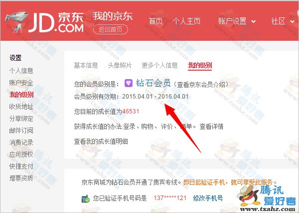3、转变后,可以在京东商城"设置 - 我的级别”里面看到有效期一年时间。