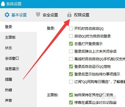 此时我们就入了我们qq的所有设置,里面设置比较多,我们点击页面上方的权限设置