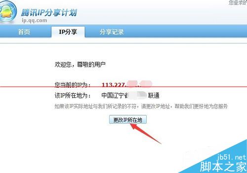 3、点击以后,出现了腾讯IP分享计划的页面,显示了我们当前的IP地址以及所在的城市,如图所示。
