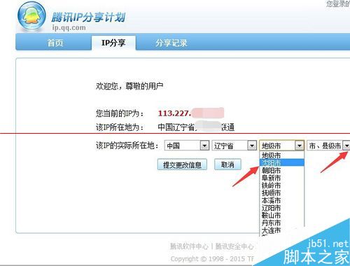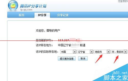 6、我们可以点击省、市后面的下拉菜单进行选择,选择IP实际所在地址,如图所示。