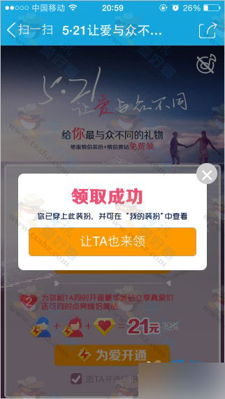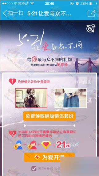 QQ黄钻520两重爱活动 21元开2月豪华版黄钻+免费领取绝版情侣装扮