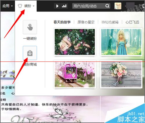2、我们在空间的上面点击装扮,可以看到在它弹出的下拉菜单中可以看到它有一个装扮商城,我们点击装扮商城(在个人中心或者是我的主页上面点击装扮商城都是可以的)。