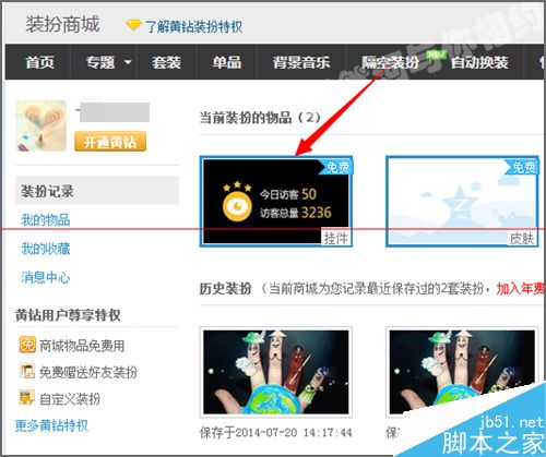 3、点击了装扮商城之后,可以在右上角看到有一个我的装扮,点击一下我的装扮。接着在弹出的页面中可以看到在装扮记录中可以看到访客挂件的物品。