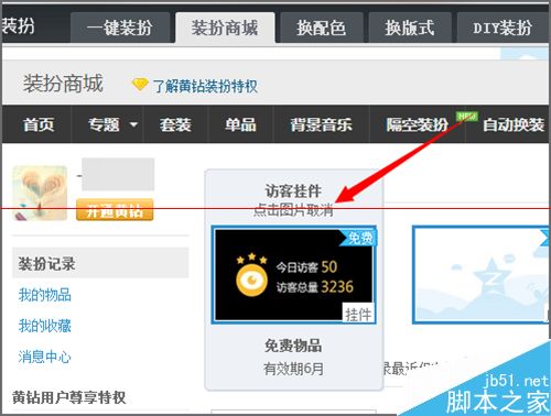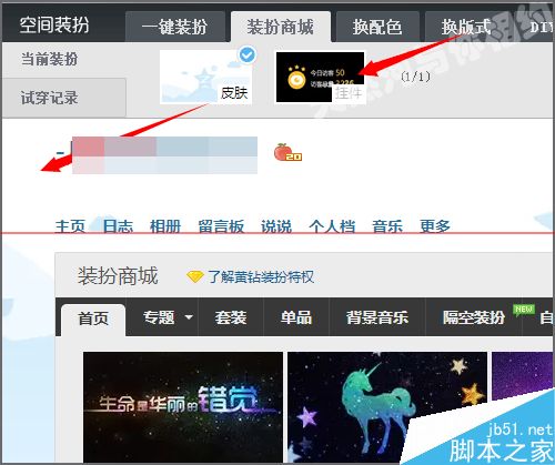 8、当然除了在挂件上面点击隐藏,也可以在空间点击装扮,然后点击装扮商城,可以看到当点击了装扮商城之后,就可以看到在空间装扮的下面,有一个当前装扮,在这里面也是可以看到它的挂件。