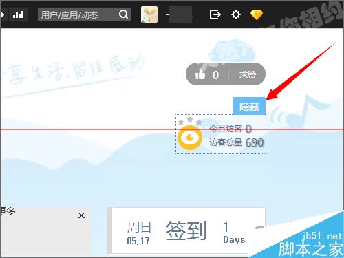 1、当我们打开空间后,在个人中心的主页右上角就可以看到这么一个访客的小挂件,本身在空间上面就可以看以它的访客的数量,而并不想要这个小挂件在这里出现。