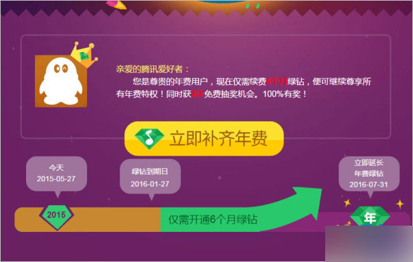 3、普通用户、绿钻用户根据不同的到期时长,分别补齐到2015年12月31日后,即可尊享相同时长的年费绿钻特权。