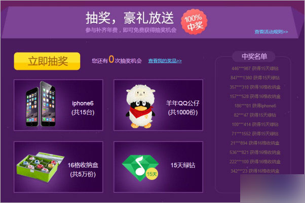4、普通用户或普通绿钻用户参与补齐成功后,可获得1次免费抽奖机会;年费绿钻用户可获得3次抽奖机会,获更多奖品!您可能随机获得iPhone6(16G)、羊年QQ公仔、16格收纳盒或15天绿钻,100%中奖!