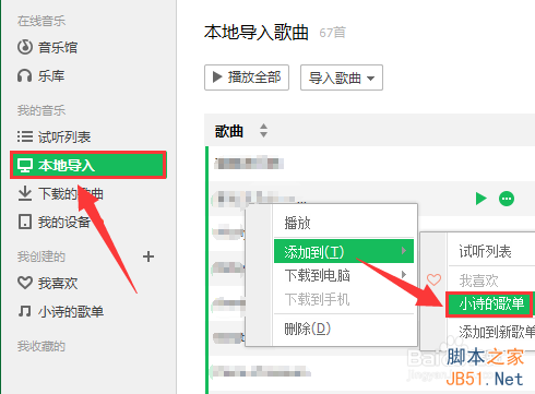 4、怎么把歌曲添加到歌单呢?问得好,点击【本地导入】打开音乐库,使用键盘上的功能键Ctrl或者Shift选择单个或者多个歌曲文件。然后右键弹出菜单选择【添加到】》【我的歌单】,就是你命名的歌单名称。