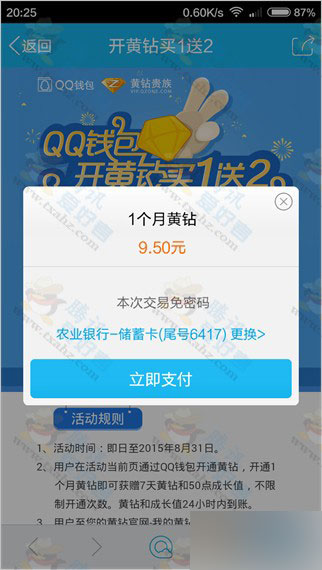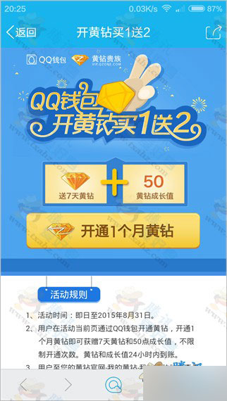 2、用户在活动当前页通过QQ钱包开通黄钻,开通1个月黄钻即可获赠7天黄钻和50点成长值,不限制开通次数。黄钻和成长值24小时内到账。