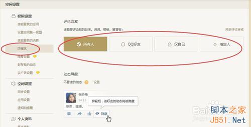 4、然后在空间设置里,有一个“权限设置”的模块,再点击“防骚扰”,点击之后,就可以对评论的回复功能、留言板留言进行设置了。选择所有好友,就是所有好友都可以评论留言,也可以选择仅QQ好友或者自己可以。
