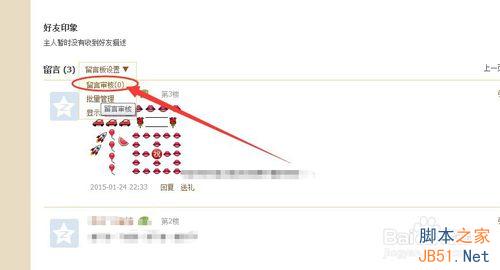 7、如果自己开启了留言审核功能的话,那么,过一段时间就需要去看下审核一下留言哦,避免有人给你留言你没有看到。审核留言,只需要你进入到留言板,然后点击“留言板设置”,在下拉菜单选择“留言审核”即可对留言进行审核了。