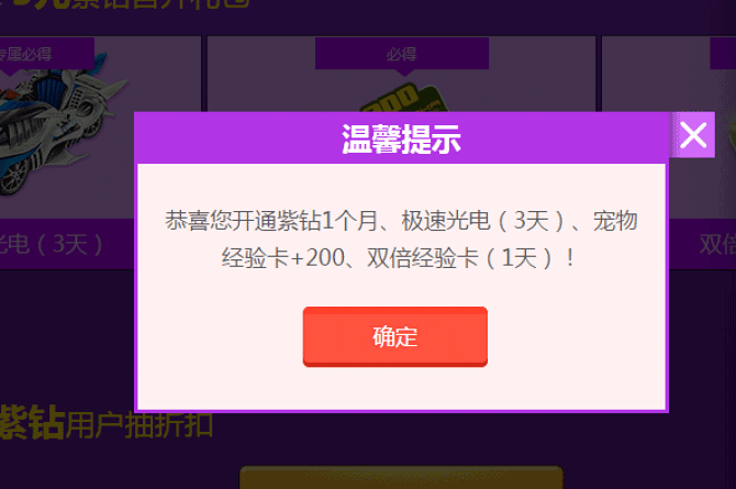 3.非紫钻玩家可享有5元开一个月紫钻的机会。开通后,可以去参加紫钻玩家“领取折扣”活动。紫钻玩家可点击“领取我的折扣”按钮获取折扣,紫钻开通成功后,获得相应奖励。每个礼包限领1次。