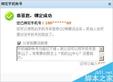 01.进入我的QQ中心(http://id.qq.com/)——>帐号——>手机辅助帐号——>立即绑定——>输入手机获取验证码——>输入验证码绑定成功。绑定手机辅助帐号是免费的,但如果在绑定的时候如果提示需要使用手机发送一条短息验证信息,那么会产生短信费用(由运营商收取)。