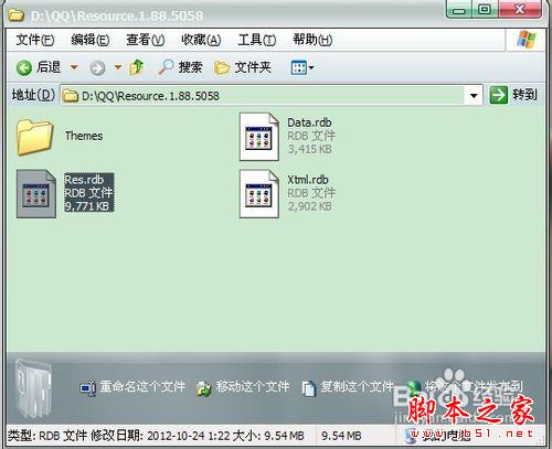 然后找到Res.rdb文件!这里我们要退出QQ操作好点,最好也来备份一个!自己不喜欢的话还可以返回来。备份好之后把这个文件复制桌面去。