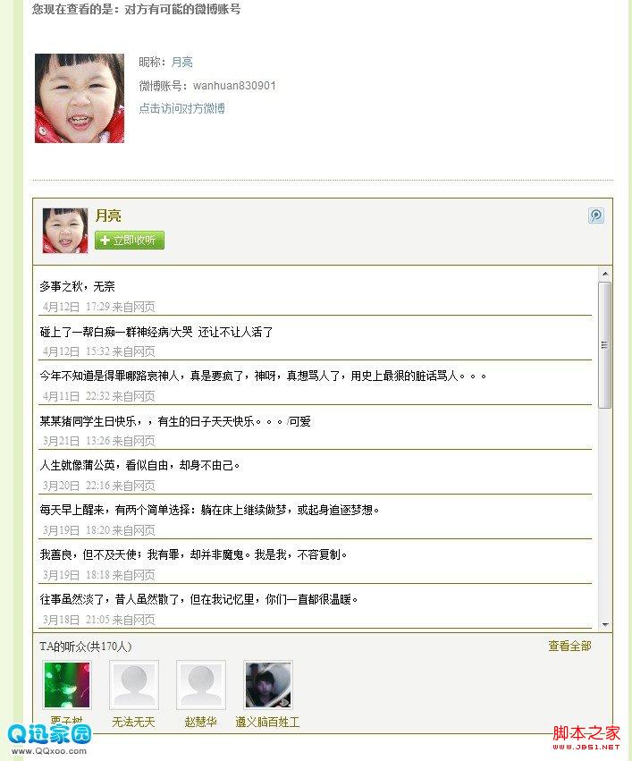 3.点击“查看TA的微博”功能,即可以查看他微博的昵称,微博帐号,微博网址及微博内容。查看微博内容也完全是匿名的,不会留下任何痕迹的。见下图