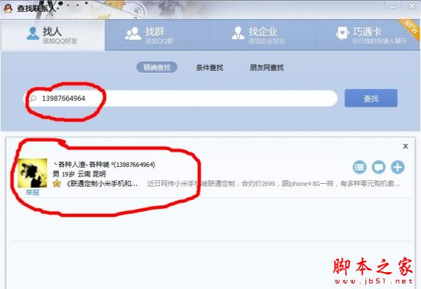 再用别的QQ查找,直接输入手机号码,就可以查找到了。
