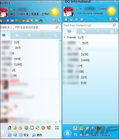 QQ2011(左)与QQ国际版V1.2版(右)对