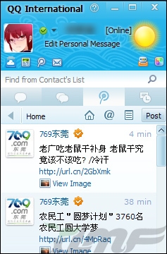 QQ国际版V1.2中新加入了腾讯微博的功能,从此上腾讯微博再也不用上网页了,这和QQ2011是一样的。
