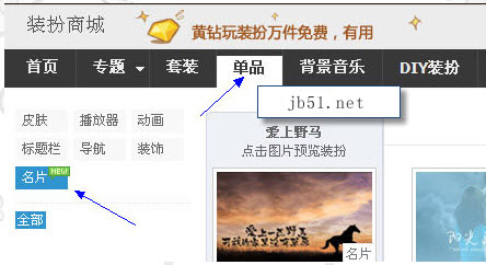 1)登陆到空间装扮商城>>,再从导航依次点击进入“单品” > “名片”分类;