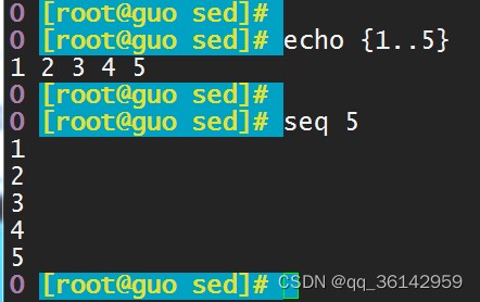 如执行echo {1..5}时输出显示在一行;如执行seq 5时输出显示为一列,每个数字一行。