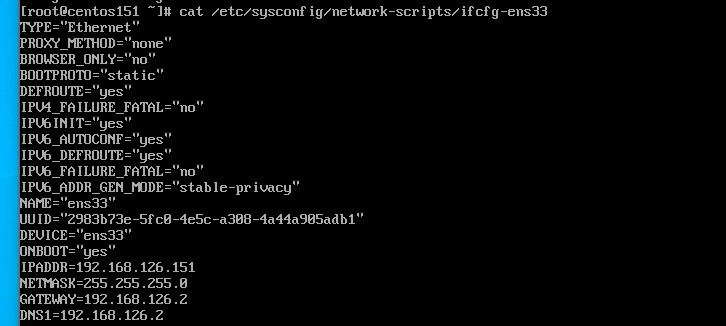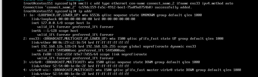 nmcli c add type ethernet con-name connect_name_1 ifname ens33 ipv4.addr 192.168.126.151/24 ipv4.gateway 192.168.126.1 ipv4.method manual