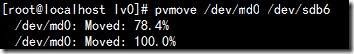 注释:若要把一个PV从VG中移除,应首先把其上所有活动PE中的数据转移到其它PV上,而新的PV必须是本VG的一部分,有足够的空间,如要把PV1:/dev/md0上的数据移到PV2:/dev/sdb6上可用,建议在转移数据之前备份LV中的数据,如果在该PV之上的LV采用交错方式存放,则这个转移过程不能被打断。