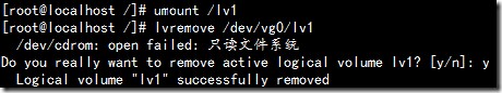 为删除一个逻辑卷,必须首先从系统卸载其上的文件系统,然后可用lvremove删除,如: