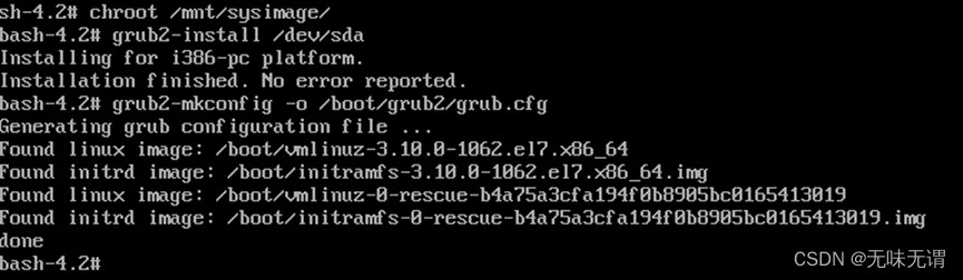 sh-4.2# grub2-install /dev/sda sh-4.2# grub2-mkconfig -o /boot/grub2/grub.cfg