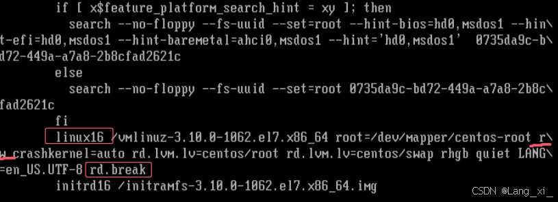 在按e进入到编辑模式时,在linux16开头的段落中,将原来的ro改为rw,再在最后加上rd.break
