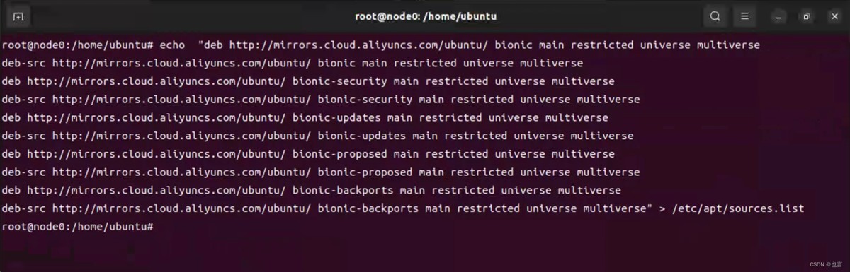 // 阿里源 > echo "deb http://mirrors.aliyun.com/ubuntu/ bionic main restricted universe multiverse deb-src http://mirrors.aliyun.com/ubuntu/ bionic main restricted universe multiverse deb http://mirrors.aliyun.com/ubuntu/ bionic-security main restricted universe multiverse deb-src http://mirrors.aliyun.com/ubuntu/ bionic-security main restricted universe multiverse deb http://mirrors.aliyun.com/ubuntu/ bionic-updates main restricted universe multiverse deb-src http://mirrors.aliyun.com/ubuntu/ bionic-updates main restricted universe multiverse deb http://mirrors.aliyun.com/ubuntu/ bionic-proposed main restricted universe multiverse deb-src http://mirrors.aliyun.com/ubuntu/ bionic-proposed main restricted universe multiverse deb http://mirrors.aliyun.com/ubuntu/ bionic-backports main restricted universe multiverse deb-src http://mirrors.aliyun.com/ubuntu/ bionic-backports main restricted universe multiverse" >> /etc/apt/sources.list