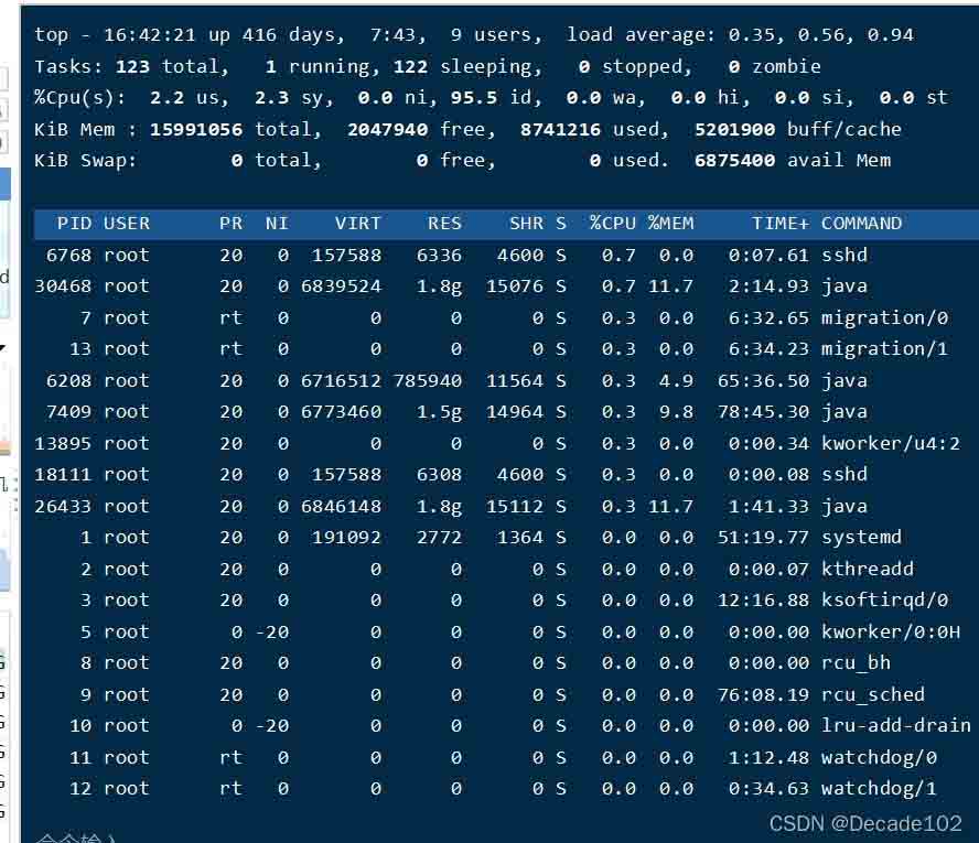 第4、5行为内存信息 第四行 KiB Mem : 15991056 total, 2041988 free, 8744720 used, 5204348 buff/cache 第五行 KiB Swap: 0 total, 0 free, 0 used. 6871932 avail Mem