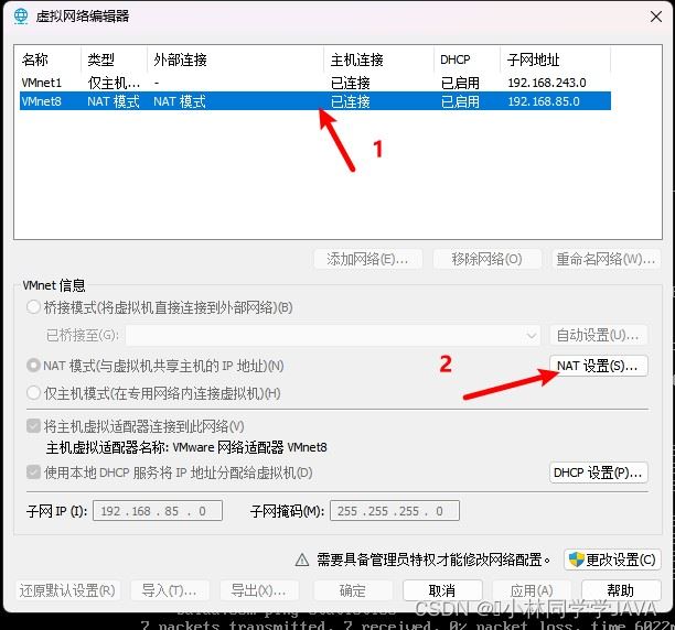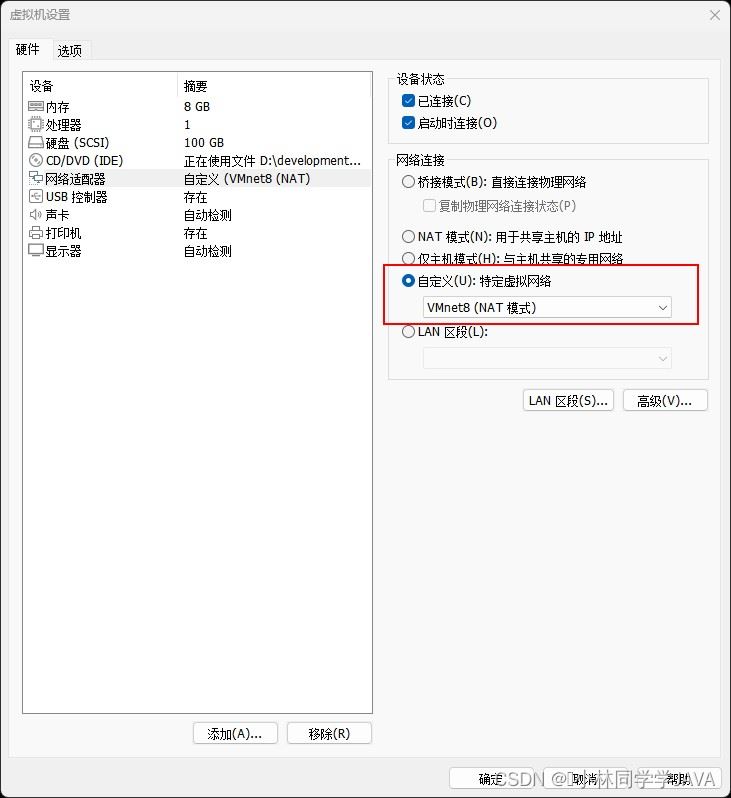 首先把网络连接设置为VMnet8虚拟网络