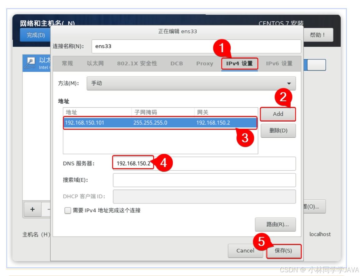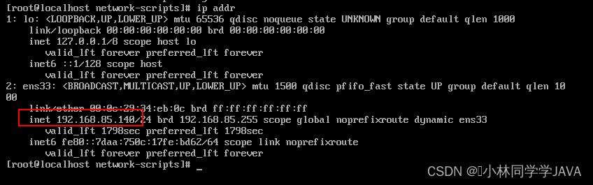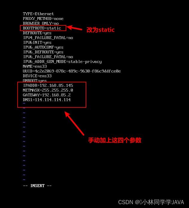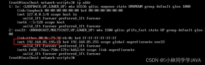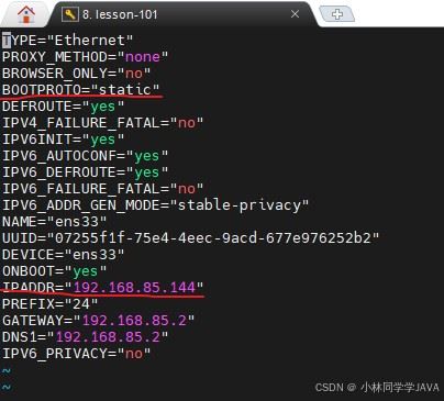 永久修改网卡IP vi /etc/sysconfig/network-scripts/ifcfg-ens33 TYPE=Ethernet #设置网卡类型,“Ethernet”表示以太网 DEVICE=ens33 #设置网卡的名称 ONBOOT=yes #设置网卡是否在 Linux 操作系统启动时激活 BOOTPROTO=static #设置网卡的配置方式,“static”表示使用静态IP地址,“dhcp”时表示动态获取地址 IPADDR=192.168.85.121 #设置网卡的 IP 地址(根据自己需要设置) NETMASK=255.255.255.0 #设置网卡的子网掩码 GATEWAY=192.168.85.2 #设置网卡的默认网关地址 DNS1=114.114.114.114 #设置DNS服务器的 IP 地址