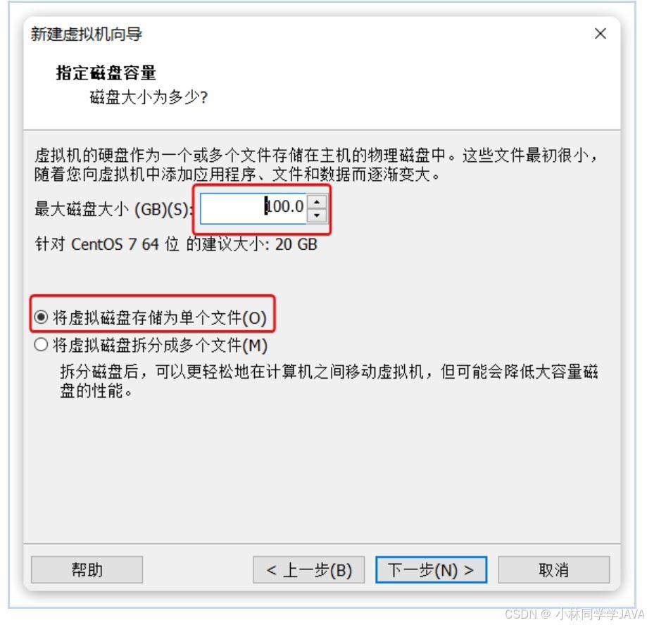 再次下一步,填写虚拟机磁盘大小。这里建议给大一点,否则将来不够用调整起来麻烦。而且这里设置大小并不是立刻占用这么多,而是设置一个上限: