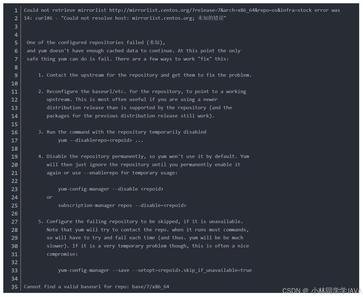 通过查看这个报错日志,关键在第一句:Could not retrieve mirrorlist http://mirrorlist.centos.org,无法访问该链接。