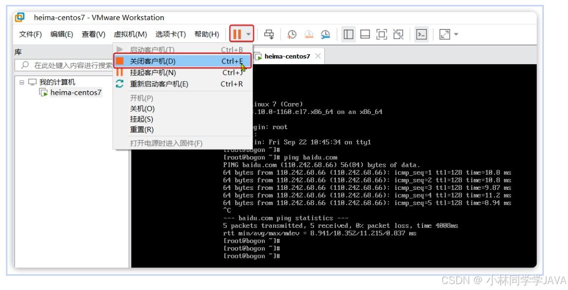 先停止虚拟机,点击VMware顶部菜单中的暂停下 拉选框,选择关闭客户机: