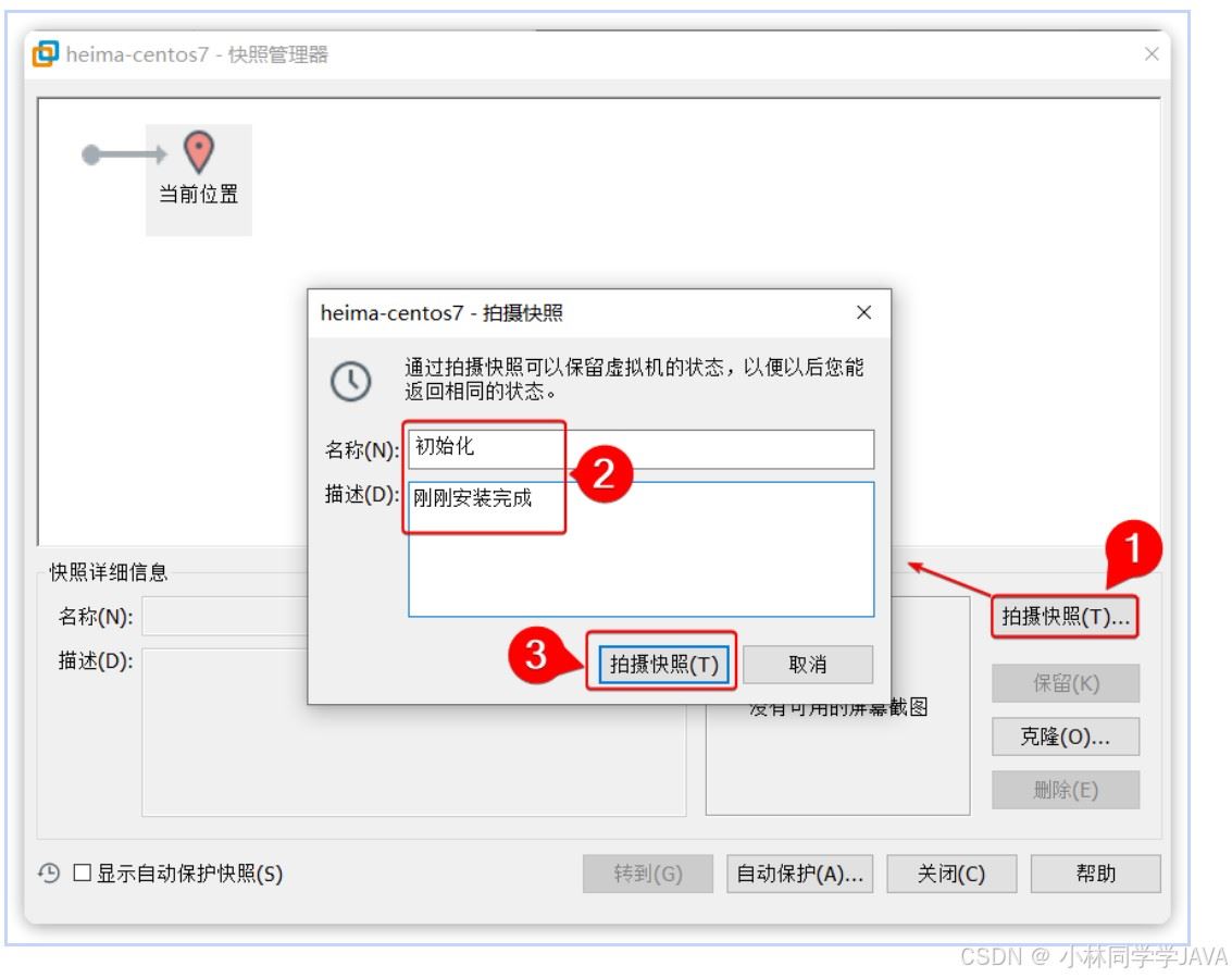 然后在弹出的快照管理窗口中,点击拍摄快照,填写新的快照信息: