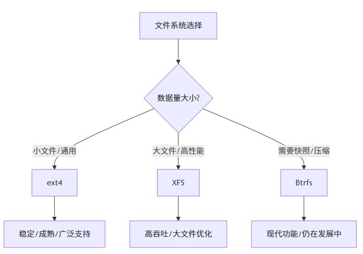 - 选择合适的文件系统类型:ext4 通用,XFS 大文件,Btrfs 高级功能