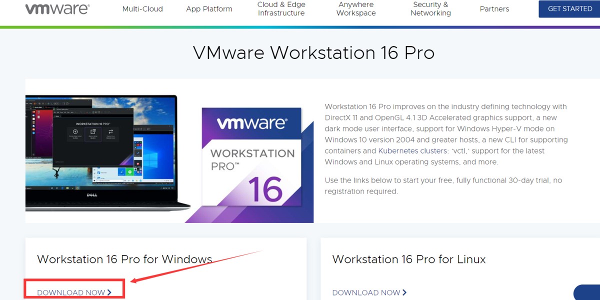 ① 进入官网之后下滑找到 Workstation 16 Pro for Windows,直接点击 DOWNLOAD NOW 即可,完成下一步。