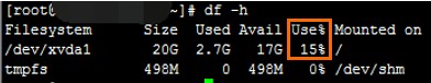 系统显示类似如下信息。例如,Use%为分区/dev/xvda1的使用率。