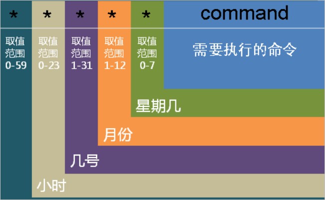 - 分别表示分钟、小时、日期、月份、星期和要执行的命令。