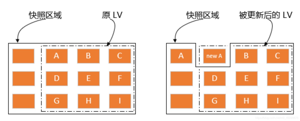 等到系统运⾏⼀阵⼦后,假设 A 区域的数据被更新了(上⾯右图所示),则更新前系统会将该区域的数据移动到快照数据卷中,所以在右图的快照数据卷中被占⽤了⼀块 PE 成为 A,⽽其他 B 到 I 的区块则还是与源数据卷共享!