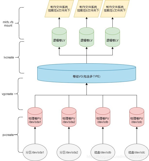 - 卷组(VG):(volume group),把多个物理卷组成⼀个逻辑的整体,这样卷组的⼤⼩就是多个硬盘之和。或者理解就是由⼀个或多个PV组成的整体。(⾯团)