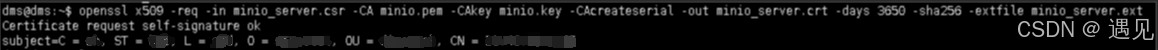 openssl req -new -key minio_server.key -out minio_server.csr 输入完命令会让输入以下几个信息: Country Name (2 letter code) [AU]: State or Province Name (full name) [Some-State]: Locality Name (eg, city) []: Organization Name (eg, company) [Internet Widgits Pty Ltd]: Organizational Unit Name (eg, section) []: Common Name (e.g. server FQDN or YOUR name) []: Email Address []: Please enter the following 'extra' attributes to be sent with your certificate request A challenge password []: An optional company name []: