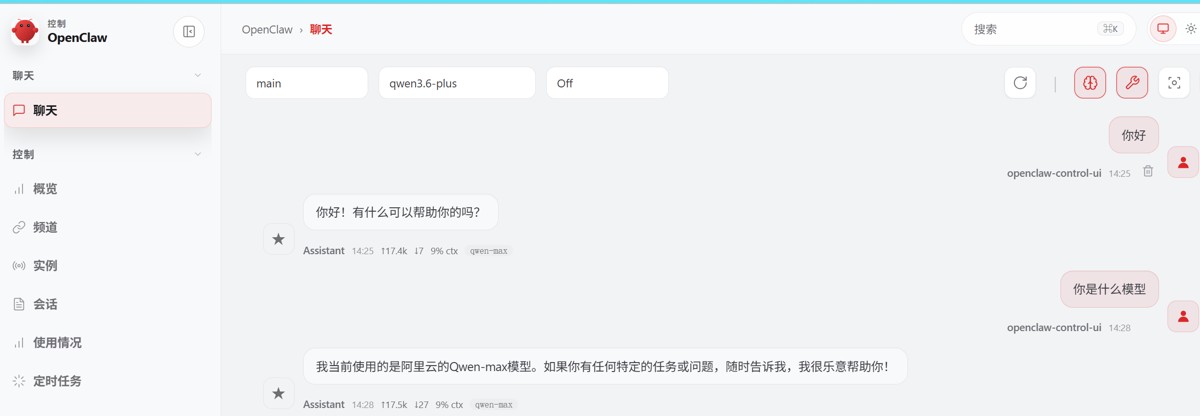 登录后,在聊天界面的模型下拉菜单中,选择aliyun_bailian/qwen-max或aliyun_bailian/qwen-plus,即可开始对话。