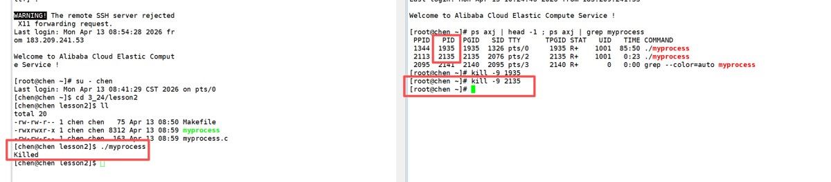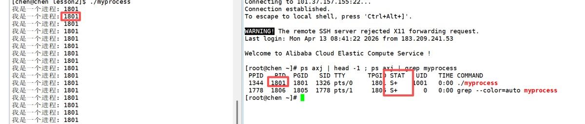 同时,我们发现子进程的进程状态由原来的 S+ 变成了 S ,也就是从前台进程变成了后台进程,所以当我们想使用 Ctrl+C 的操作去关闭进程的时候,是关闭不了的,只有通过kill指令才能关闭。这是因为:S+ 中的 + 代表进程属于前台终端进程组,与控制终端关联。当父进程(终端 Shell)退出后,孤儿进程被内核重新托管给 init 进程,并脱离原终端,不再属于前台进程组,因此 + 符号消失,状态变为 S。进程本身仍处于可中断睡眠状态,并未发生本质改变。