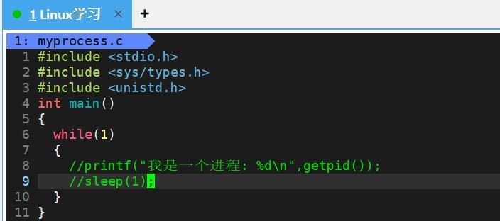 首先我们写出这样一段代码,执行一个死循环,一直睡眠 1 秒,然后去查看进程:
