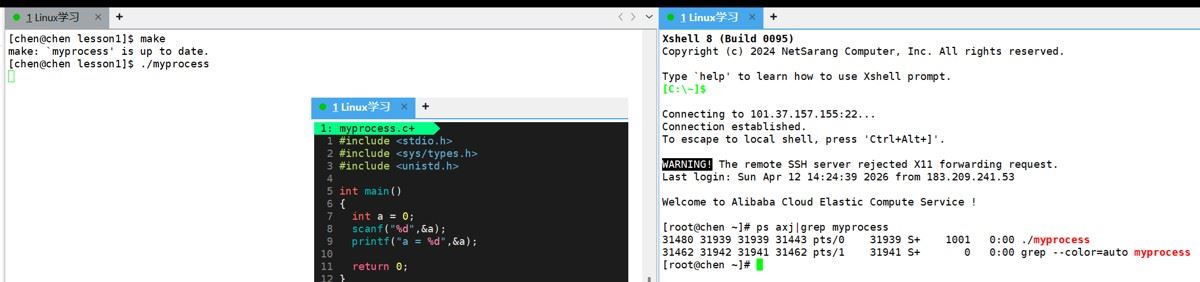对于上图中这个代码,我们因为写了一个scanf,所以需要我们先从键盘上写入内容,然后再读取才能继续运行。同时我们查看进程,可以看到这个myprocess可执行程序是一个正在运行的进程,所以这种一个进程卡住不动的现象,就叫做阻塞。